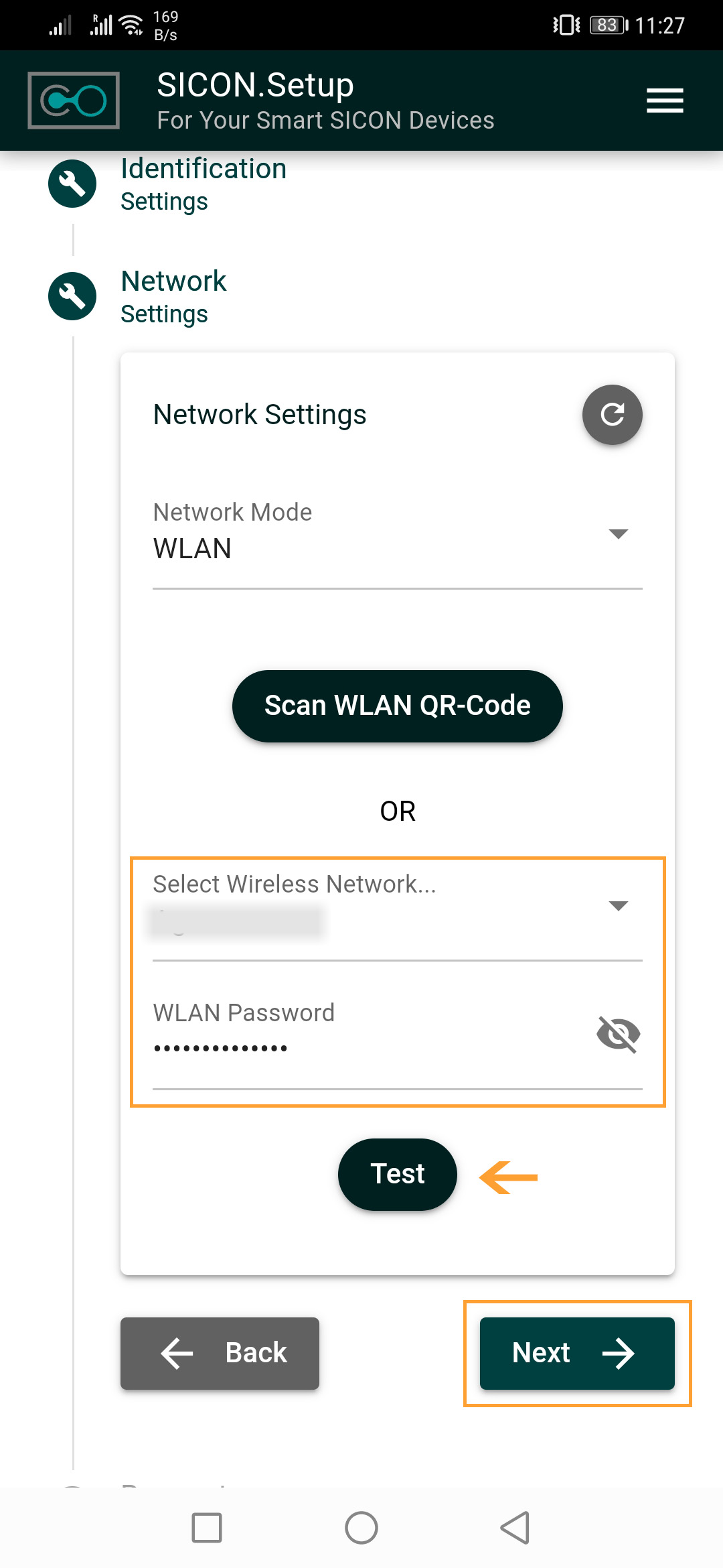 11. Geben Sie das WLAN-Passwort des Netzwerks ein. Überprüfen Sie mit TEST BUTTON , ob das eingegebene Passwort korrekt ist und ob SICON.PLUG eine Verbindung zum Netzwerk herstellen kann. Klicken Sie abschließend auf NEXT