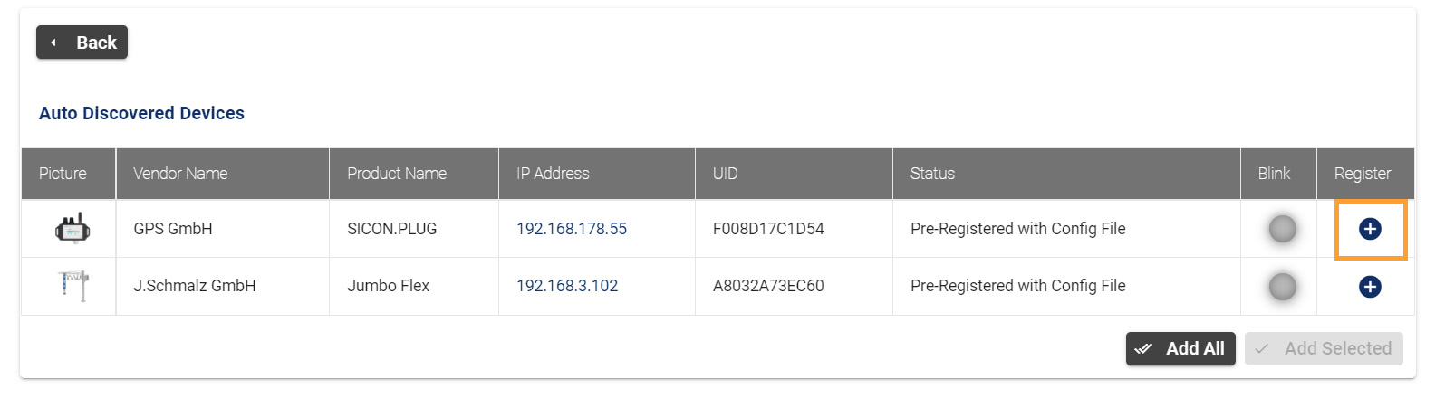 Der SICON.PLUG ist nun für SICON.OS sichtbar und kann dort registriert werden.