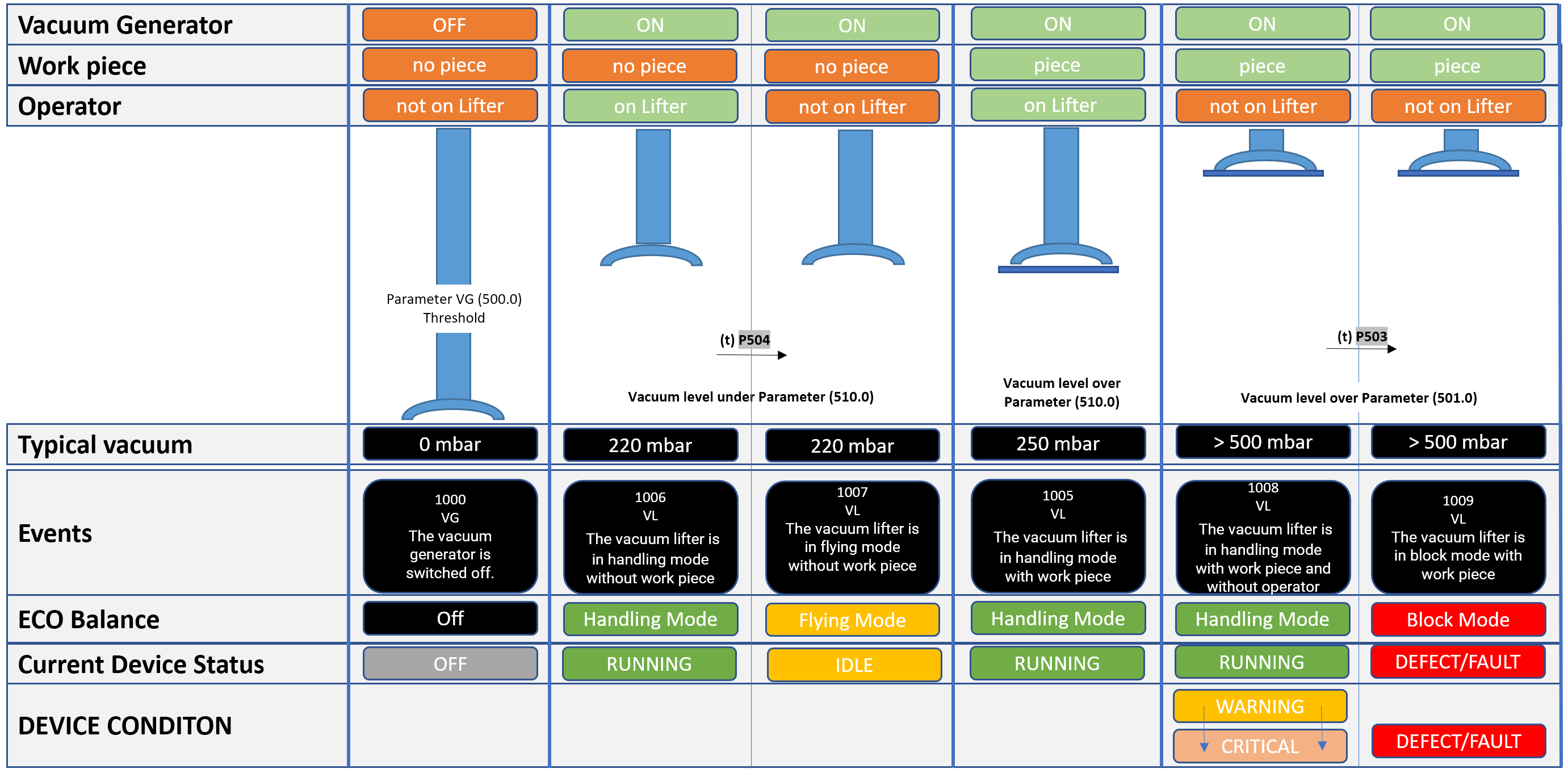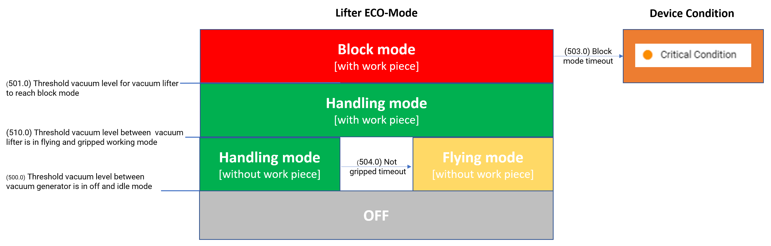 Handling mode → vacuum lifter is in normal operating and operator is picking and dropping parts