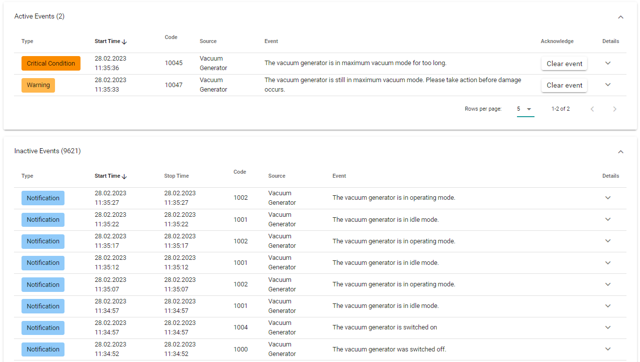 Device Management / Parameter → Settings for events of vacuum generator