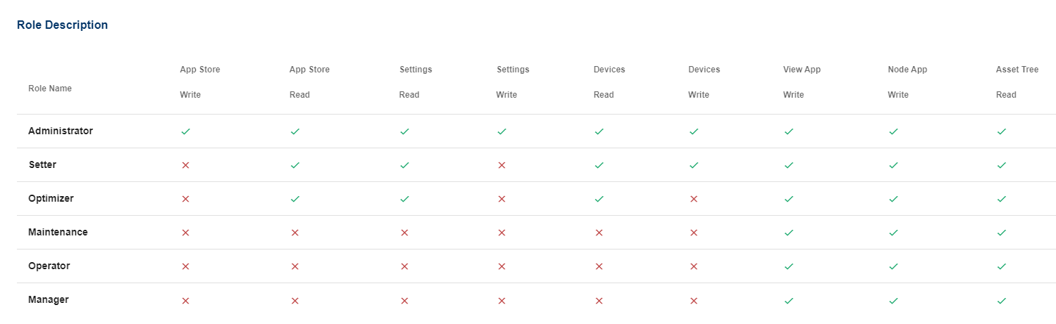 It is important to create or choose a user with a role that is able to read device data. In your SICON.OS installation, you can navigate to Settings → Users → Roles to get an overview. In the example below, the user must be an Optimizer, Setter or Administrator.