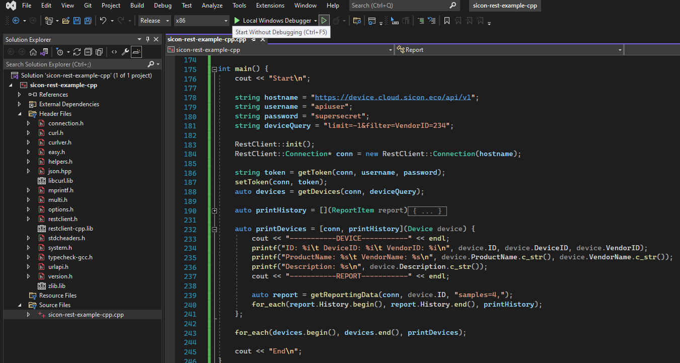 Open the sicon-rest-example-cpp.sln file. This opens the project in Visual Studio.