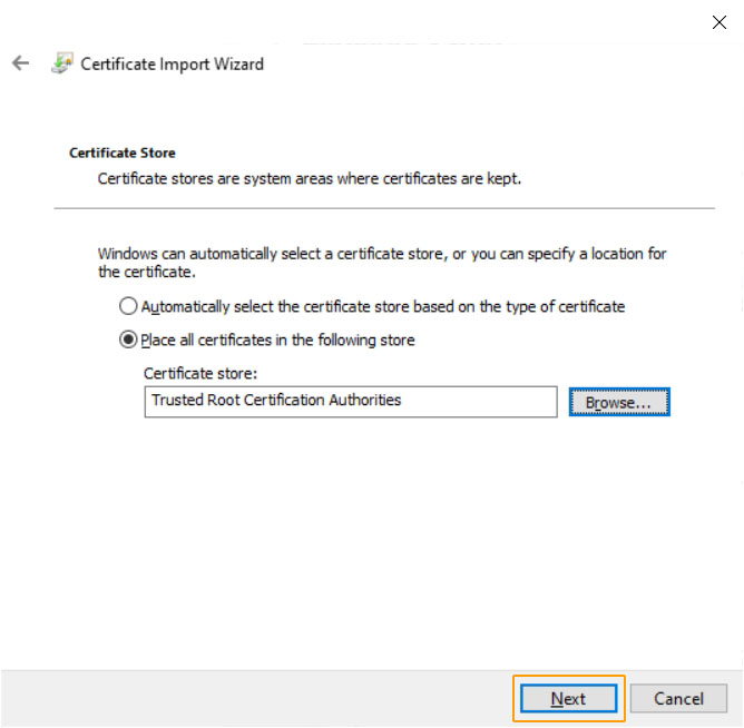 Confirm the store by selecting "Place all certificates in the following store" and click on "Browse"