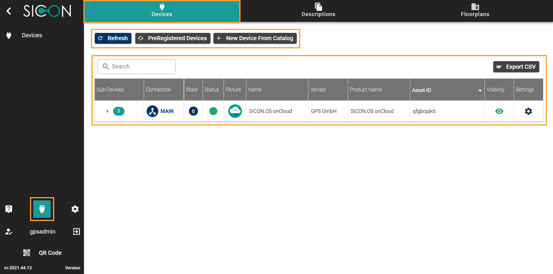 Under Devices, you can have the information about the Main Device or the Sub-Devices, PreRegistered Devices, add new Devices from catalog. The complete information is exhibit for the Device like mode of Connection, State, Status, Device image, Vendor name, Product name, Asset-ID, visibility and device setting.