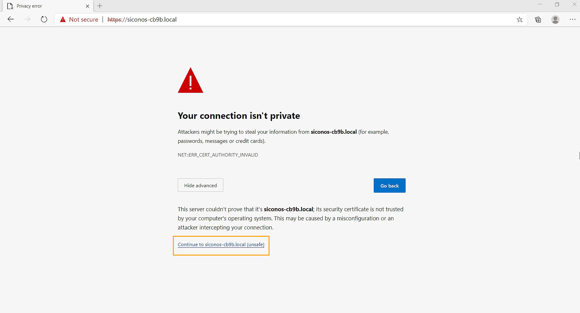 Click on "Continue to hostname.local (Unsafe)"