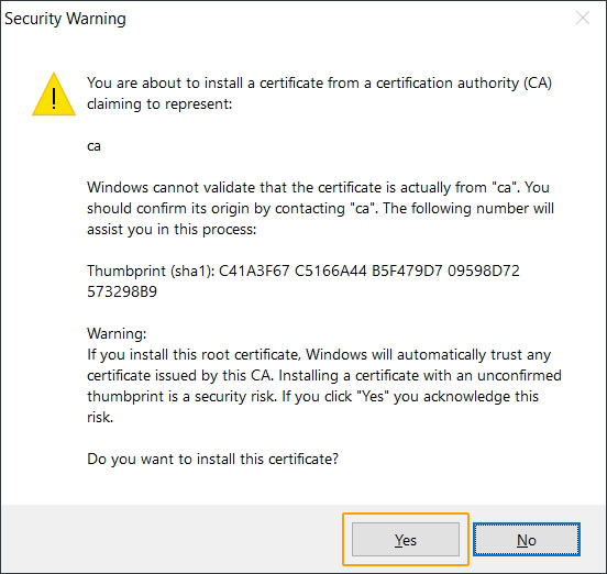Confirm the Security Warning message of the Installation by clicking on "Yes" and then click "Ok".