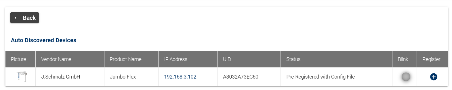 On this screen you can see the basic information of the devices which are pre-registered with SICON.OS. Here you can individually click on the Register button to register the device to SICON.OS