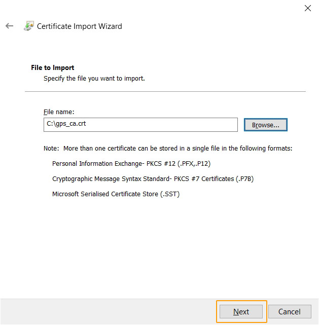 There are three methods to import the GPS Root Certificate on the Operating System level, import via :