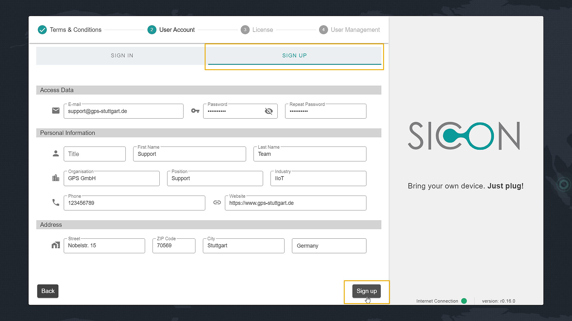 • Create Admin account for your SICON.OS by giving Username and Password.