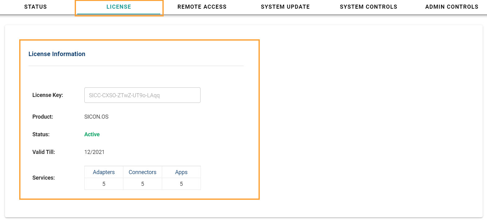 Here you will get the information about the License like License Key, name of product, status, validity and services.