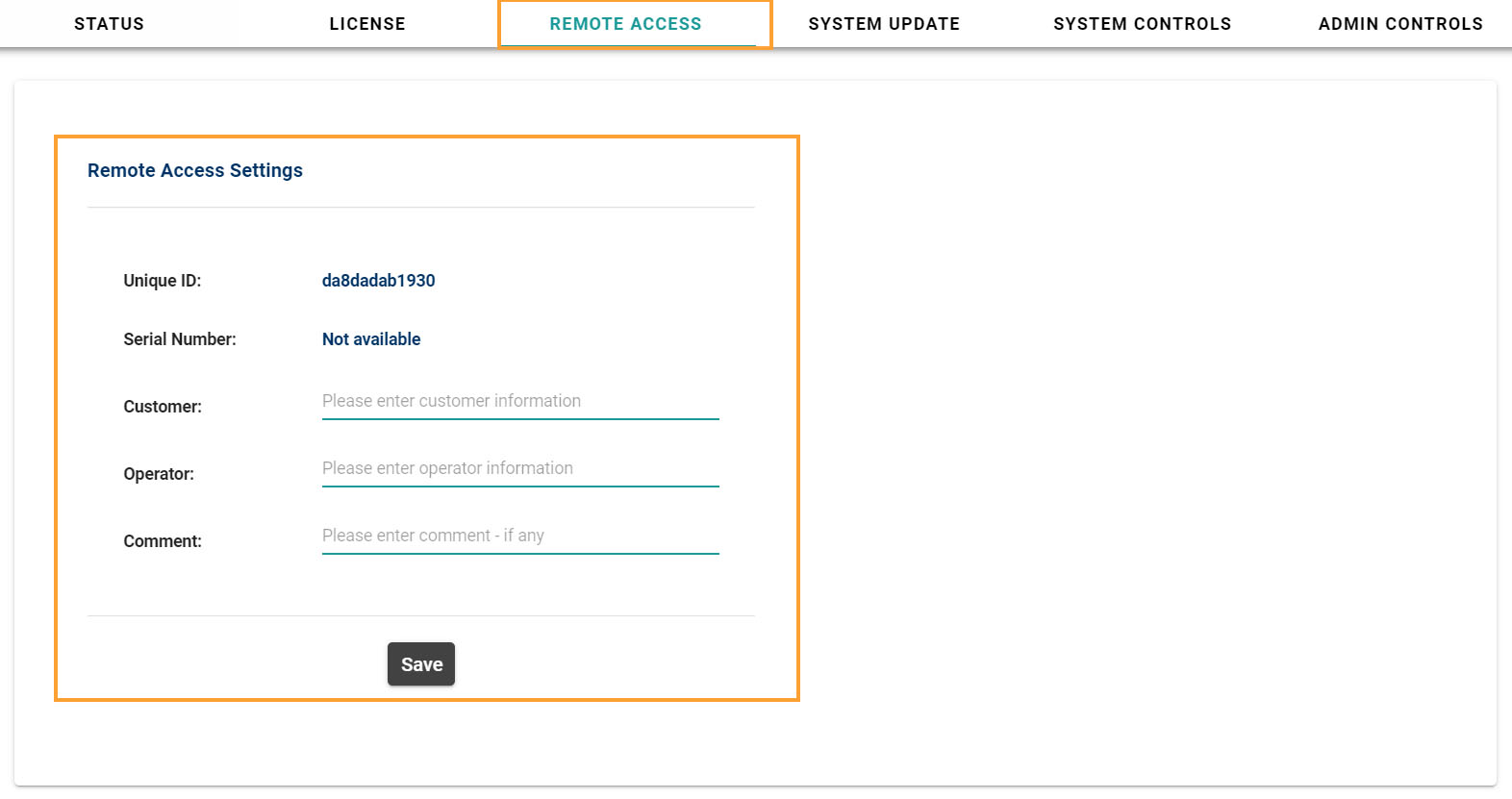 Here you can change the Remote Access settings, you can add customer information, operator information and comment (if any)