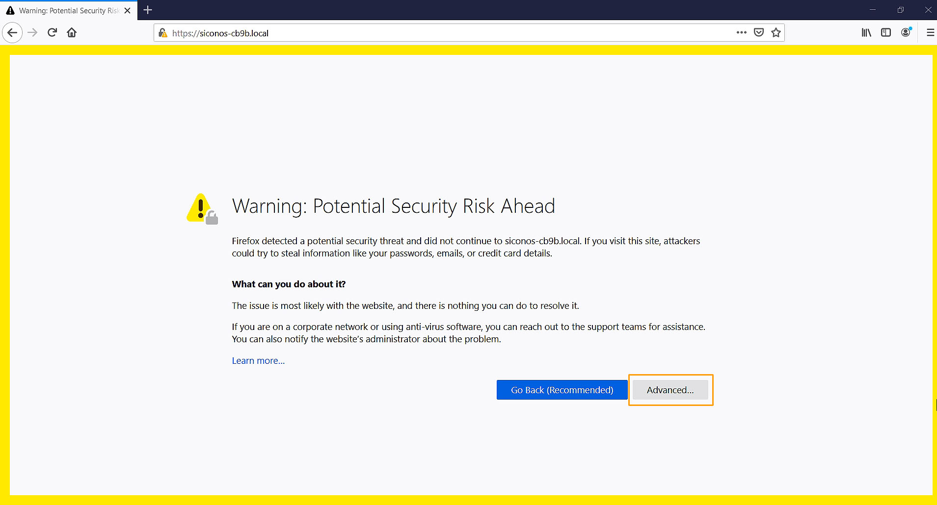 • Click on "Continue to hostname.local (Unsafe)"
