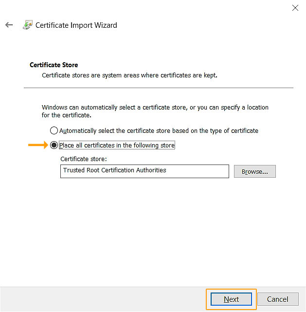 Confirm the store by selecting "Place all certificates in the following store" and click on "Browse"
