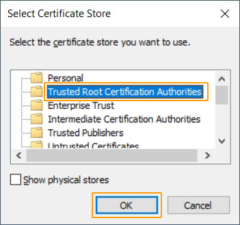 Select the correct store (aka category) for the Certificate: "Trusted Root Certification Authorities" and then click on "OK"
