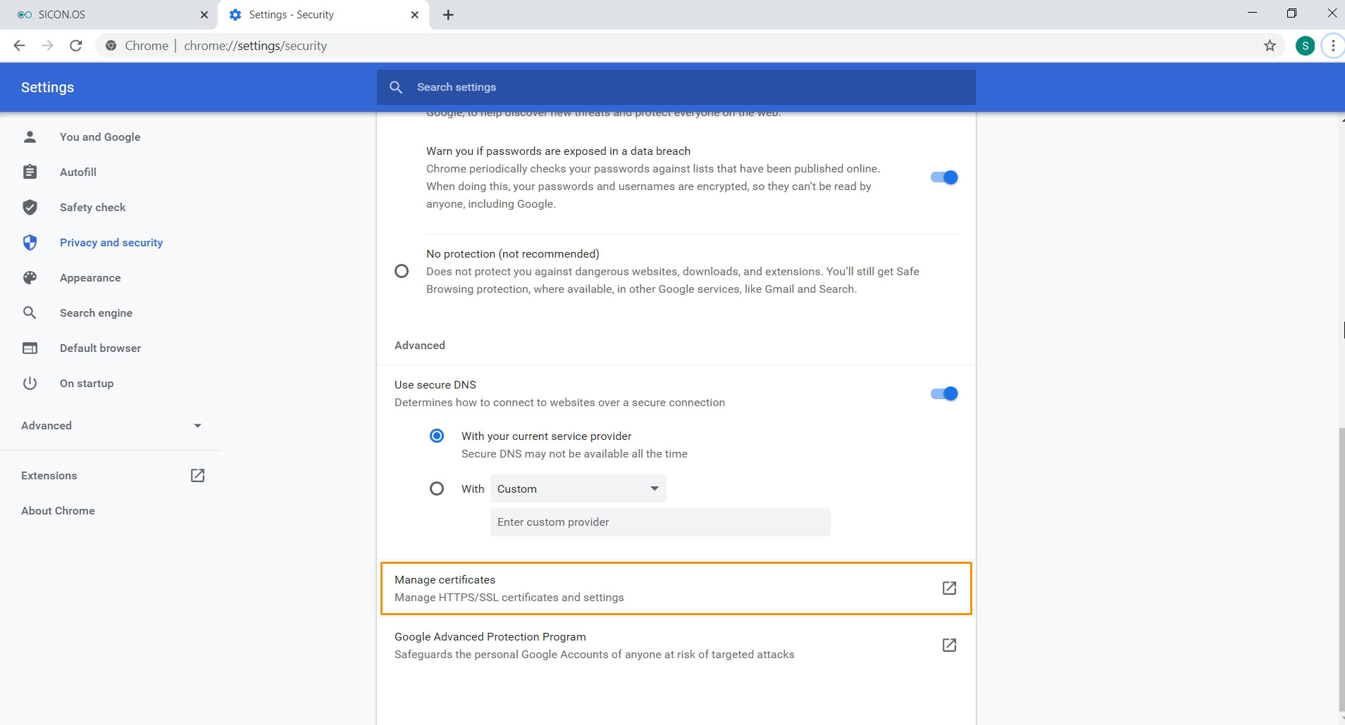 Click on "Manage certificates"