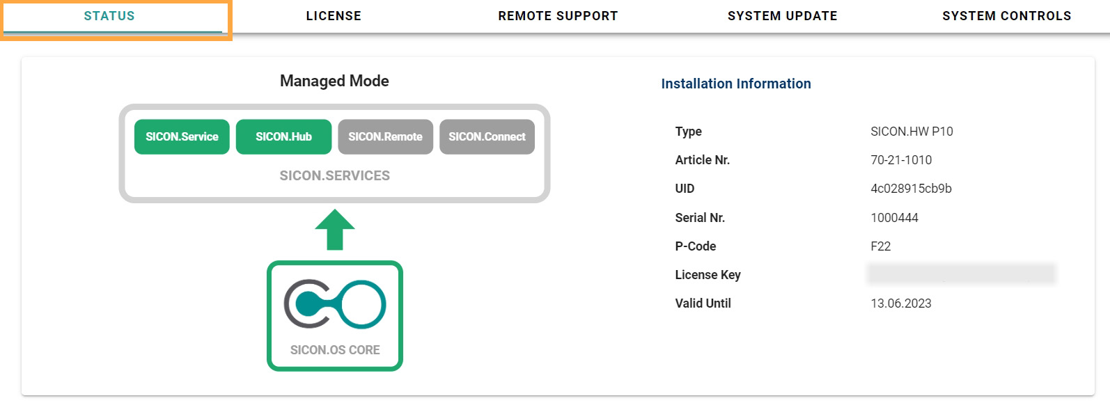 • Managed Mode: It shows you your device status whether your device is active on SICON.SERVICE, SICON.Hub, SICON.REMOTE, SICON.CONNECT