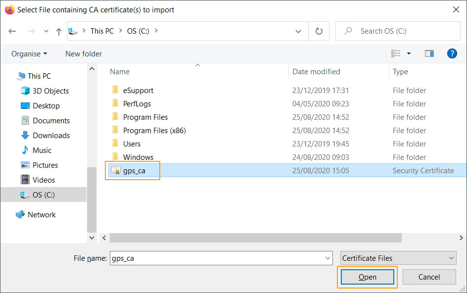 • Select the GPS Root Certificate file from your system and click on "Open".