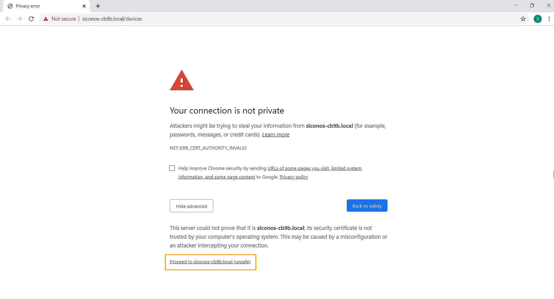Click on "Proceed to hostname.local (Unsafe)"