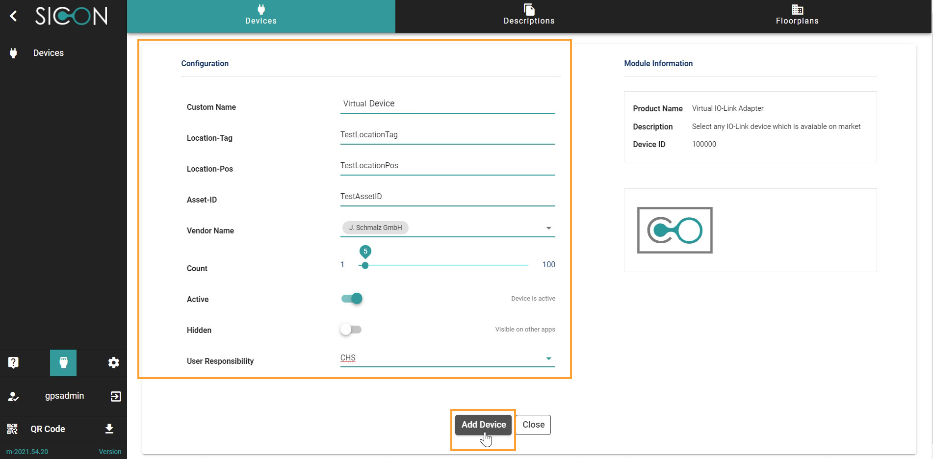 Now select the Virtual IO-Link Adapter to add virtual devices to SICON.OS