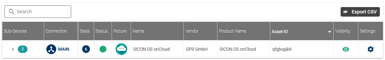 • Complete information Table: On this view you see the devices which are connected to the SICON.OS. According to the connection, each device is viewed in a parent child hierarchy.