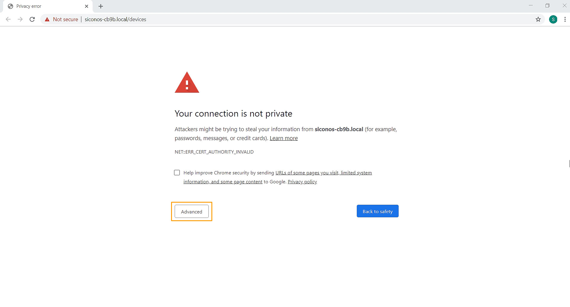 Click on "Continue to hostname.local (Unsafe)"