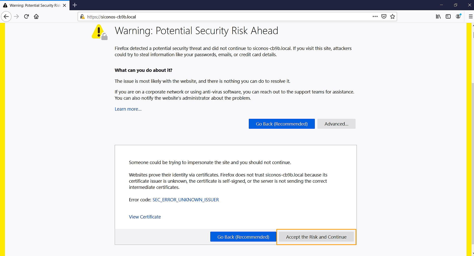 Click on "Accept the Risk and Continue"