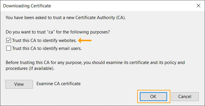 Set the purpose for the Certificate by selecting the option "Trust this CA to identify websites." and then click "OK"