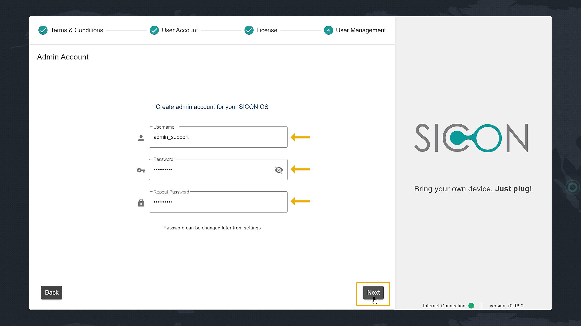• Create Admin account for your SICON.OS by giving Username and Password.