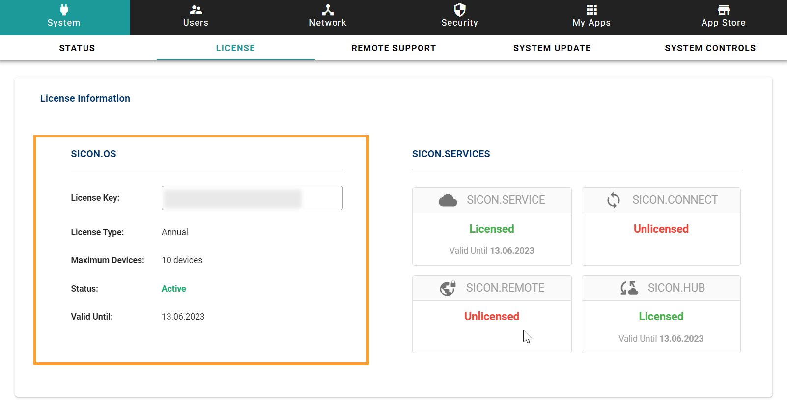 Here you can control certain system settings via enable or disable the connection to external SICON services: