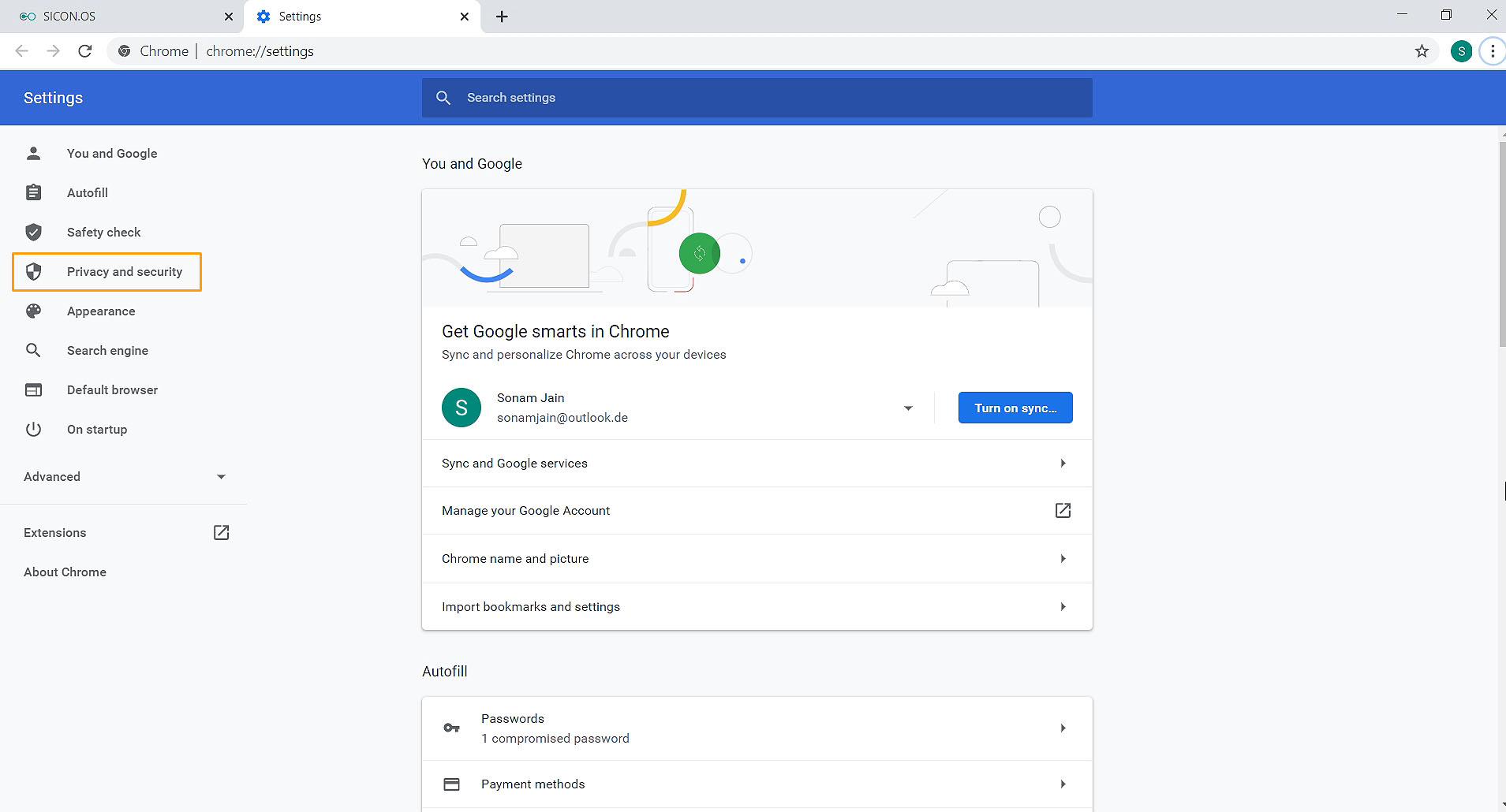 Click to open "Privacy and security"