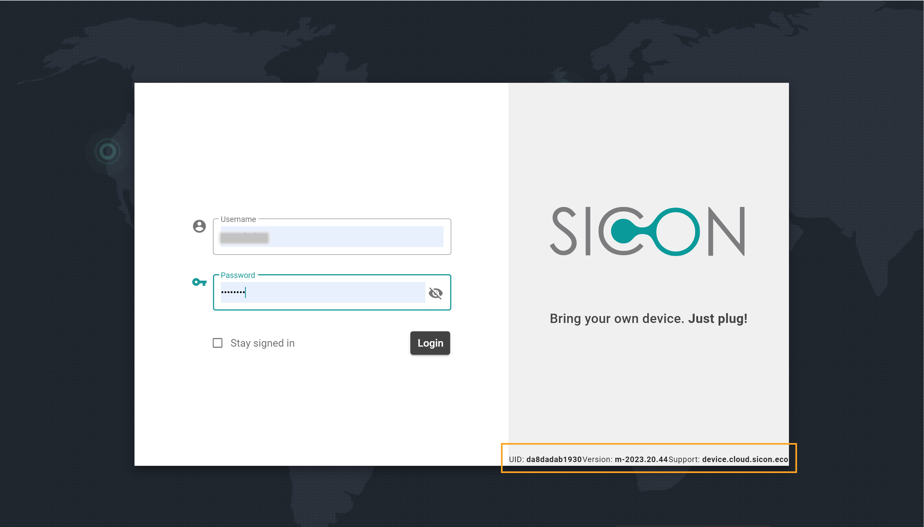 Login Screen with Information for UID, Software-Version and Remote Support Number​