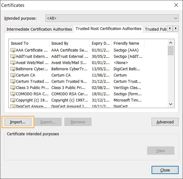 Select the correct store (aka category) for the Certificate: "Trusted Root Certification Authorities" and then click on "OK"