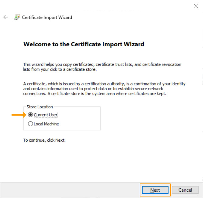 The Certificate Import Wizard will get open. Click on "Next" to continue.