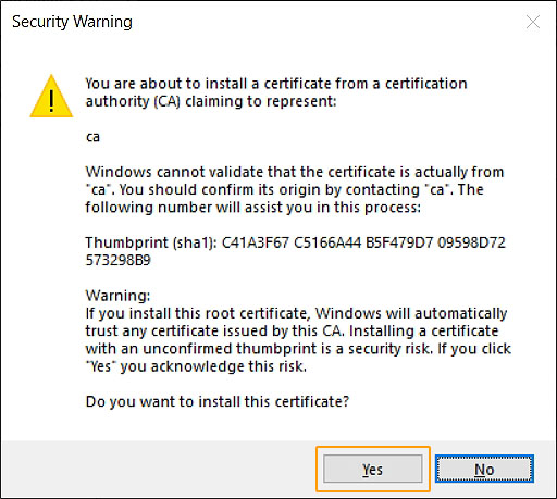 Confirm the Security Warning message of the Installation by clicking on "Yes" and then click "Ok".